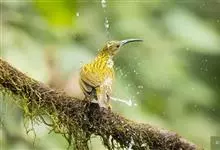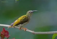 纹背捕蛛鸟:为太阳鸟科捕蛛鸟属的鸟类。是太阳鸟科中体型较大的一种,体重25-45克,体长160-210毫米。嘴粗长而尖且向下弯曲。上体橄榄黄色具黑色中央斑纹。下体淡黄白色满布黑色纵纹,尾具黑色次端斑。…全部>>