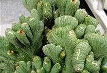 麒麟掌,是大戟科大戟属多年生植物。为金刚纂的带化变异变种。麒麟掌的株乳汁丰富;它的茎圆柱状,上部多分枝,绿色;叶互生,稀少,常生于嫩枝顶端脊上,倒卵形、倒卵状长圆形或匙形,顶端钝圆,具小凸尖,全缘,…全部>>