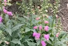 毛地黄是车前科、毛地黄属一年生或多年生草本植物。株高0.5—1米,茎直立,少分枝,全株被灰白色短柔毛和腺毛叶基生,呈莲座状,卵圆形或卵状披针形。顶生总状花序,花冠钟状,紫红色,内面有浅白斑点。菊果卵形。…全部>>