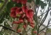 翅果刺桐 Merr.)是豆科,刺桐属乔木,高12-15米,具粗壮的刺。羽状复叶具3小叶,小叶膜质,卵状三角形,先端短渐尖,基部圆或宽楔形,两面无毛;总状花序长7-10厘米,有褐色绒毛;花红色,花萼钟状,…全部>>