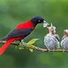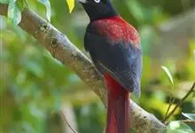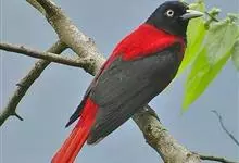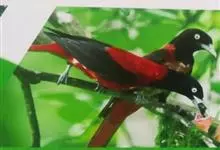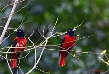 朱鹂:中等鸟类,体长23-28厘米。雄鸟绛紫红色,头、上胸及翼黑色。雌鸟上背及背部深灰色,尾覆羽及尾绛紫红色,腹部及下胸白而密布黑色纵纹。与鹊色鹂幼鸟的区别在上背灰色较深,下体白色较少且纵纹较粗。…全部>>