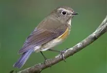 红胁蓝尾鸲俗名:蓝点冈子、蓝尾巴根子、蓝尾杰、蓝尾欧鸲。体型略小而喉白的鸲。特征为橘黄色两胁与白色腹部及臀成对比。雄鸟上体蓝色,眉纹白;亚成鸟及雌鸟褐色,尾蓝。…全部>>