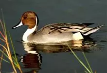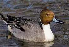 针尾鸭,是雁形目鸭科鸭属动物。体长约75厘米的大型戏水鸭,雄鸟头暗褐色,颈侧有白色纹路,向下与胸部白色相连,中央一对尾羽特别长;背灰色,有黑色细纹;翼镜绿色,胸腹白色,尾下覆羽黑色;雌鸟体羽大致为褐色,…全部>>