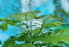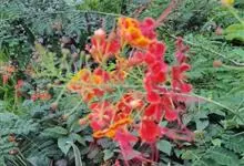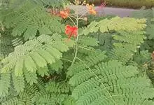 洋金凤 Sw.),豆科小凤花属灌木状或小乔木植物,枝无毛,绿或粉绿色;二回羽状复叶;总状花序伞房状,萼片无毛,花瓣橙红或黄色,圆形,花丝红色,子房无毛,花柱橙黄色;荚果窄而薄,…全部>>