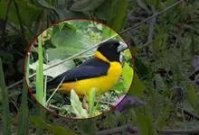 黄颈拟蜡嘴雀:小型鸟类,体长20-22厘米。嘴粗大,黑色。雄鸟整个头、颈、颏、喉和上胸辉黑色,两翅和尾亦为黑色,其余上体橙黄色,下体鲜黄色。雌鸟头、颈、颏、喉和上胸中央灰色或暗灰色,…全部>>