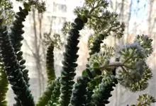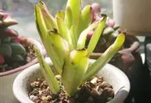 筒叶花月,是景天科青锁龙属的多年生草本植物。植株多分株,灌木状,茎较粗壮,圆柱形,表皮灰褐色;叶片肉质,互生,呈圆筒状,簇生于茎或分枝顶端,叶端呈斜截形,截面为椭圆形;花呈星状,淡白色;花期秋季。…全部>>