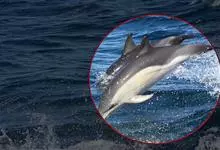 真海豚,身体细而流线型。体色十分复杂而独特,通常十字交叉型,黄褐色在前灰色在后,背面黑色向下延伸,在背鳍下面形成V形区域。具白色胸斑。头前额喙平缓向倾斜,喙细长,相对较短。黑唇末端白色。背鳍大,…全部>>