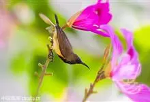黑胸太阳鸟:小型鸟类,体长9-15厘米。嘴细长而向下曲。雄鸟中央尾羽特长,尾呈楔形,头顶至后颈紫蓝色具金属光泽;背褐红色,腰有一黄色横带,尾上覆羽和尾紫蓝色;颏、喉和上胸乌黑色,有的下胸为硫黄色,…全部>>
