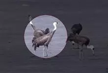 沙丘鹤别名棕鹤、加拿大鹤,是鹤形目鹤科鹤属大型涉禽。成鸟两性相似,雌鹤略小,眼先、前额和头顶裸露部分红色;上体石板灰色,翅覆羽较淡,羽缘锈棕色,羽轴深黑色;尾羽石板灰色,颈部灰蓝色,…全部>>