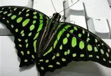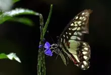 青带凤蝶Graphium sarpedon ,又名青凤蝶,是最普遍的中型凤蝶,飞行速度很快。青带凤蝶的翅膀中央有许多浅蓝色的斑点,很整齐地排列成一条直线。这些斑点由上而下逐渐变大,就像一条青色的带子。全部>>