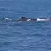 真海豚,身体细而流线型。体色十分复杂而独特,通常十字交叉型,黄褐色在前灰色在后,背面黑色向下延伸,在背鳍下面形成V形区域。具白色胸斑。头前额喙平缓向倾斜,喙细长,相对较短。黑唇末端白色。背鳍大,…全部>>