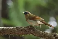 棕噪鹛中型鸟类,体长25~28厘米。上体赭褐色,头顶具黑色羽缘,尾上覆羽灰白色,尾羽棕栗色,外侧尾羽具宽阔的白色端斑。额、眼先、眼周、耳羽上部、脸前部和颏黑色,眼周裸皮蓝色,极为醒目。喉和上胸与背同色,…全部>>