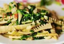 油焖竹笋是一道色香味俱全的名菜,属于浙菜系。竹笋去掉老根和笋衣,切成寸段,放入开水锅中,加盐焯烫2分钟,去除过多的草酸钙,捞出沥干水分待用。另起锅烧热,下宽油,下姜片煸香,下笋段翻炒至表面微焦,…全部>>