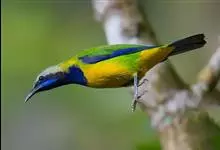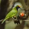 蓝翅叶鹎:小型鸟类,体长15-18厘米。雄鸟通体草绿色,尾蓝绿色,肩和翅亮蓝 色,胸缀有黄色,颏、喉黑色。雌鸟颏,喉蓝绿色。栖息在海拔1500米以下的常绿阔叶林、次生林和林缘疏林灌丛中。…全部>>