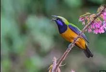 橙腹叶鹎体形大小和金额叶鹎相似,体长16~20厘米。额至后颈黄绿色,其余上体绿色,小覆羽亮钴蓝色,形成明显的肩斑。颏、喉、上胸黑色具钴蓝色髭纹,其余下体橙色。飞羽和尾羽雄鸟黑色、雌鸟绿色。…全部>>