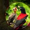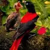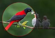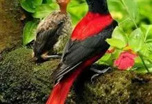 朱鹂:中等鸟类,体长23-28厘米。雄鸟绛紫红色,头、上胸及翼黑色。雌鸟上背及背部深灰色,尾覆羽及尾绛紫红色,腹部及下胸白而密布黑色纵纹。与鹊色鹂幼鸟的区别在上背灰色较深,下体白色较少且纵纹较粗。…全部>>