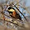 杂色山雀,是山雀科山雀属的一种动物。体重17-18克,体长125-140毫米。雌雄羽色相似。额、眼先、耳羽至颈侧乳黄色,头顶至后颈黑色,后头中央有一白斑。上背栗色,上体余部及翼蓝灰色。颏、喉黑色,…全部>>