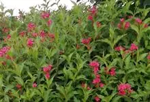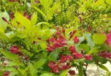 红王子锦带花是忍冬科锦带花属的落叶开张性灌木。株高1 -2米;嫩枝淡红色,老枝灰褐色;单叶对生,呈椭圆形,先端渐尖,叶缘有锯齿,红枝及叶脉具柔毛;花冠漏斗状钟形,花冠筒中部以下变细,聚伞花序,…全部>>