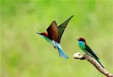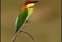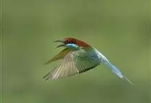 栗喉蜂虎是蜂虎科蜂虎属的鸟类。有热带鸟类羽毛艳丽的特征:喉部是栗红色的,黑色的过眼纹,翅膀和背部是绿色的,尾翼是蓝色的,飞行时翅膀下面的羽毛是橙黄色的,在阳光的照射下,它们全身闪烁着金属般的艳丽光泽,…全部>>