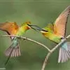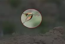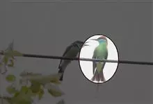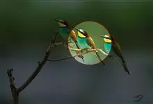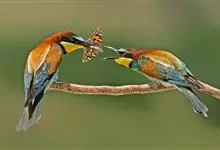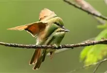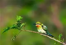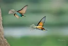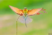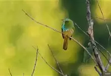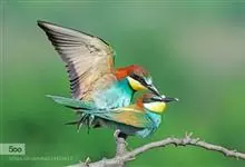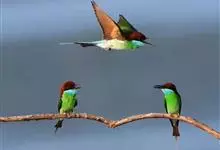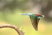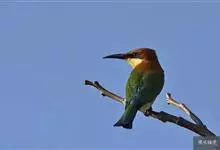 栗喉蜂虎是蜂虎科蜂虎属的鸟类。有热带鸟类羽毛艳丽的特征:喉部是栗红色的,黑色的过眼纹,翅膀和背部是绿色的,尾翼是蓝色的,飞行时翅膀下面的羽毛是橙黄色的,在阳光的照射下,它们全身闪烁着金属般的艳丽光泽,…全部>>