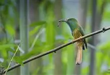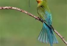 蓝喉蜂是蜂虎科蜂虎属鸟类。体长26-28厘米,嘴长而弯曲,有明显细长的中央尾羽。头部、颈部和背部为巧克力色,有黑色眼纹。喉部、腰部和尾羽为蓝色。腹部和两翼为绿色。幼鸟外观似成鸟,头部、颈部和背部为绿色,…全部>>