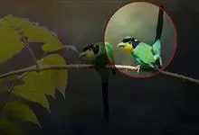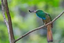 蓝须夜蜂虎是佛法僧目、蜂虎科的鸟类,体长约30厘米,是绿色林栖型蜂虎,蓝色的胸羽蓬松,嘴厚重而下弯。成鸟顶冠淡蓝,腹部棕黄带绿色纵纹。尾羽腹面黄褐。亚成鸟全身绿色。喉、胸部中央的羽甚长和亮色;该物种…全部>>