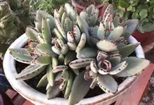 褐斑伽蓝是景天科伽蓝菜属的多年生多肉类植物,茎直立,多分枝,叶生于枝上,肉质叶片匙形,上面密被白色绒毛,下部全缘,叶缘上部有缺刻,缺刻处有深褐或棕色斑块。褐斑伽蓝原产非洲的马达加斯加岛。…全部>>