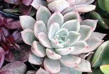 紫珍珠是景天科石莲花属的多年生肉质草本植物。植株中小型;叶片肉质,匙形,呈莲座状紧密排列;叶片粉紫色,叶缘呈粉白色,光照充足时颜色亮丽,不足时叶色会呈现深绿色或灰绿色,叶面光滑,被轻微白粉,…全部>>