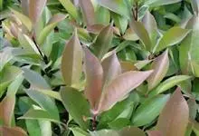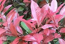 红叶石楠 是蔷薇科,石楠属杂交种,为常绿小乔木或灌木,乔木高可达5米、灌木高可达2米。叶片革质,长圆形至倒卵状、披针形,叶端渐尖,叶基楔形,叶缘有带腺的锯齿,花多而密,复伞房花序,花白色,梨果黄红色,…全部>>