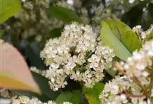 石楠 Kalkman),是蔷薇科石楠属的常绿乔木,高5~12米,株型紧凑,树冠圆球形。树枝为褐灰色;鳞片为褐色,没有毛;叶片革质,长椭圆至侧卵状椭圆形,有锯齿,新叶红色光亮。复伞房花序,白色小花,…全部>>