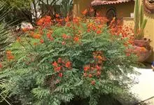 洋金凤 Sw.),豆科小凤花属灌木状或小乔木植物,枝无毛,绿或粉绿色;二回羽状复叶;总状花序伞房状,萼片无毛,花瓣橙红或黄色,圆形,花丝红色,子房无毛,花柱橙黄色;荚果窄而薄,…全部>>
