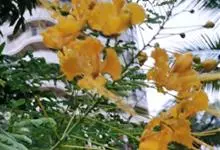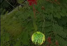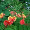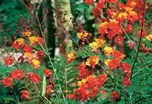 洋金凤 Sw.),豆科小凤花属灌木状或小乔木植物,枝无毛,绿或粉绿色;二回羽状复叶;总状花序伞房状,萼片无毛,花瓣橙红或黄色,圆形,花丝红色,子房无毛,花柱橙黄色;荚果窄而薄,…全部>>