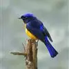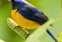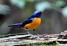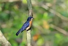 棕腹大仙鹟:体重24-28克,体长15-17厘米,是一种小型的色彩亮丽的鹟。雄鸟上体深蓝,下体棕色,脸黑,额、颈侧小块斑、翼角及腰部亮丽闪辉蓝色。与棕腹仙鹟易混淆,区别在色彩较暗。雌鸟灰褐,…全部>>