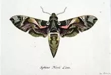 夹竹桃天蛾是鳞翅目天蛾科昆虫。又称夹竹桃白腰天蛾、巴纹天蛾。成虫呈青黑色,四翅正反面都以橄榄色为主调,而前翅中部则略显粉紫色;前翅基部灰白色,中央有1个黑点,…全部>>