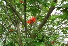 刺桐,是豆科刺桐属乔木植物。树皮灰褐色;分枝有圆锥形黑色皮刺;叶柄无毛,无刺;花密集,成对着生;花梗被茸毛,花冠红色;果实为圆柱形,微弯曲;花期3月;果期8月。刺桐因枝干间有圆锥形棘刺,故名。…全部>>