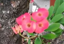 铁海棠为大戟科大戟属蔓生灌木植物;茎多分枝,具纵棱,呈旋转状;叶互生,通常集中于嫩枝上;每个花序基部边缘具微小的红色尖头;苞叶先端圆且具小尖头,无柄,上面鲜红色,下面淡红色;苞片丝状;子房光滑无毛,…全部>>