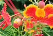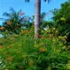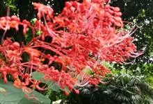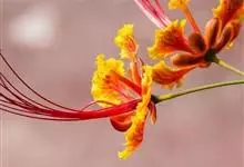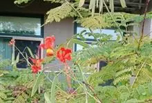 洋金凤 Sw.),豆科小凤花属灌木状或小乔木植物,枝无毛,绿或粉绿色;二回羽状复叶;总状花序伞房状,萼片无毛,花瓣橙红或黄色,圆形,花丝红色,子房无毛,花柱橙黄色;荚果窄而薄,…全部>>