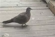 珠颈斑鸠,别名花斑鸠、珍珠鸠、花脖斑鸠、鸪鹪,是鸠鸽科副斑鸠属鸟类。体型中等,体长27~34cm,体重120~205g,雌鸟和雄鸟羽色相似,但雌鸟不如雄鸟羽色亮泽。珠颈斑鸠前额至头顶羽色稍淡,…全部>>