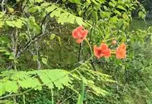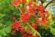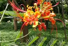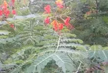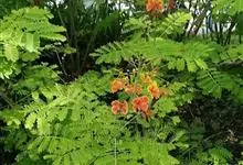 洋金凤 Sw.),豆科小凤花属灌木状或小乔木植物,枝无毛,绿或粉绿色;二回羽状复叶;总状花序伞房状,萼片无毛,花瓣橙红或黄色,圆形,花丝红色,子房无毛,花柱橙黄色;荚果窄而薄,…全部>>