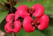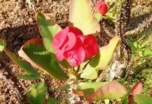 铁海棠为大戟科大戟属蔓生灌木植物;茎多分枝,具纵棱,呈旋转状;叶互生,通常集中于嫩枝上;每个花序基部边缘具微小的红色尖头;苞叶先端圆且具小尖头,无柄,上面鲜红色,下面淡红色;苞片丝状;子房光滑无毛,…全部>>