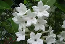 素馨花,木犀科素馨属多年生的攀援灌木植物。攀援灌木,小枝圆柱形,具棱或沟;叶对生,叶轴常具窄翼,小叶片卵形或长卵形;聚伞花序顶生或腋生,花序梗长,苞片线形,花萼无毛,裂片锥状线形,花冠白色,…全部>>