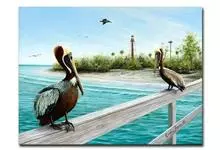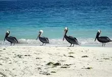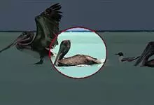 褐鹈鹕:是鹈鹕家族中体型最小的成员。体型粗大,体重6.5-9千克。嘴形宽大直长,上嘴尖端朝下弯曲,呈钩状;下嘴分左右二支,其间有一巨大而能扩缩的皮肤喉囊;鼻孔小,而位于嘴基。眼前部裸出。颈长而较细小…全部>>