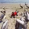卷羽鹈鹕是一种大型的白色水鸟,体羽灰白,眼浅黄,喉囊桔黄或黄色,颈背具卷曲的冠羽。是生活在沼泽及浅水湖的一种鹈鹕,主要为内陆淡水湿地的鸟,但也出现在海岸潟湖及河口,在小岛的大片芦苇或空旷处营巢繁殖。…全部>>