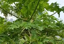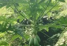 番木瓜,番木瓜科番木瓜属的常绿软木质小乔木,高达10米,具有乳汁;茎不分枝或有时于损伤处分枝;叶大且聚生于茎顶,近似盾形,叶柄中空;花单性或两性,有些品种雄株偶尔生两性花或雌花,…全部>>