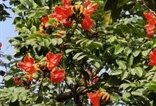 火焰树是紫葳科、火焰树属乔木,树皮平滑,灰褐色。奇数羽状复叶,对生,连叶柄长达45厘米;小叶13-17枚,叶片椭圆形至倒卵形,伞房状总状花序,顶生,密集;被褐色微柔毛,具有明显的皮孔;花冠一侧膨大,…全部>>