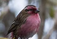 藏朱雀:全长约17-18厘米。雄鸟头部深红色具光辉,喉部暗红色具白色点斑;背部灰白色,各羽具玫瑰红色羽端,形成许多斑纹;腰部淡玫瑰红色;翅暗褐色,沾灰白,羽端沾玫瑰红或灰白色;尾暗棕色,端缘玫瑰红色…全部>>