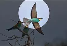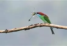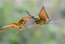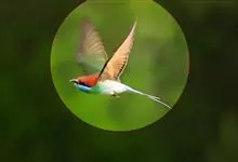 栗喉蜂虎是蜂虎科蜂虎属的鸟类。有热带鸟类羽毛艳丽的特征:喉部是栗红色的,黑色的过眼纹,翅膀和背部是绿色的,尾翼是蓝色的,飞行时翅膀下面的羽毛是橙黄色的,在阳光的照射下,它们全身闪烁着金属般的艳丽光泽,…全部>>