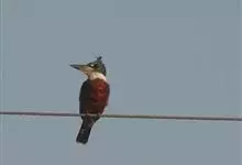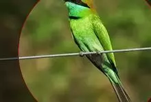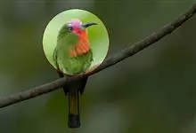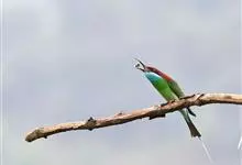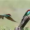 栗喉蜂虎是蜂虎科蜂虎属的鸟类。有热带鸟类羽毛艳丽的特征:喉部是栗红色的,黑色的过眼纹,翅膀和背部是绿色的,尾翼是蓝色的,飞行时翅膀下面的羽毛是橙黄色的,在阳光的照射下,它们全身闪烁着金属般的艳丽光泽,…全部>>