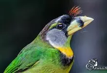 金喉拟啄木鸟,是须鴷科、拟啄木鸟属的鸟类。金喉拟啄木鸟为小型鸟类,体长19-24厘米。额深红色,头顶金黄色,后枕具一大块深红色斑,耳羽和头侧银灰色,上体草绿色,颏和上喉金黄色,下喉淡银灰色,…全部>>