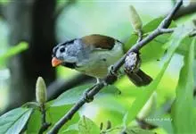 点胸鸦雀是莺科、鸦雀属小型鸟类,体长18-21厘米。头顶至枕橙棕色,嘴橙黄色、短而粗厚,脸皮黄色,耳覆羽和颊后部黑色,眼圈白色。上体棕褐色。颏黑色,其余下体淡皮黄白色,喉和上胸具黑色矢状斑。…全部>>